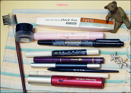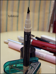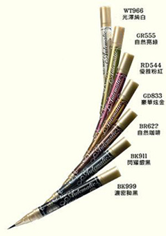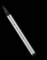 我第一支正式買的眼線,是Kate的極細眼線筆,她的筆尖就像毛筆,有一定的軟度,裡面裝墨汁會自動出水,也許是第一次就用到這種眼線筆,造成後來也很習慣這一種。我要感謝教育部(我的感謝病又來了),編制國小生每週有兩堂毛筆課,而我又是個順天命的乖小孩,每週都聽話的一筆一劃細心刻劃,以致後來一拿這種眼線筆,湧出某種熟悉感馬上就上手,還曾因為畫得細又流暢,被朋友稱讚:有畫就像沒畫一樣耶!(這稱讚真誠懇又有深度...)