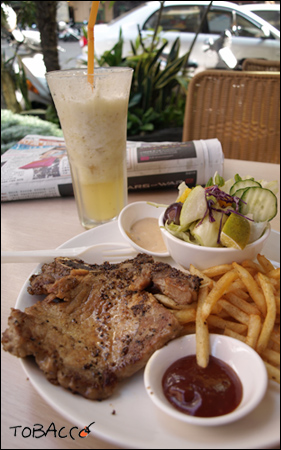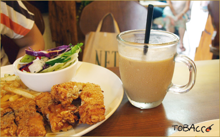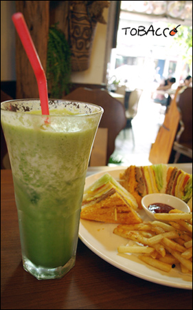 套餐都有附飲料,有咖啡、茶可以選,我朋友選了顏色跟口味都有點像奶茶的咖啡,(我咖啡喝太重@@),我則是加了30元,換了這杯綠綠的苦瓜西洋芹蔬菜汁,像這樣風和日麗晴空萬里的日子當然要點很健康又降火氣的蔬菜汁囉!(其實是熬夜火氣大要降火= =),我還蠻怕吃苦瓜的,但是這杯不會很苦,還在能接受的範圍內,喝了時候還可以喝到細細的蔬菜纖維喔!!(超健康的啦~)
