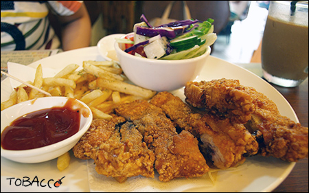 朋友點炸雞排餐,雞排餐還附上新鮮沙拉,薯條可以免費換成白飯,如果很餓,加點一碗白飯是10元,我有吃朋友的一塊炸雞,不會很乾又很油,還蠻多汁的,朋友拿沾沙拉的千島沙拉醬來沾雞排,她說這樣更好吃。她說的。= ="