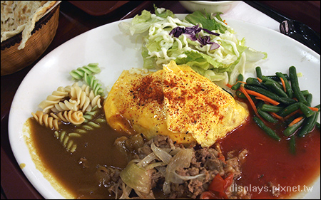 ↑我點了咖哩牛肉蛋包飯,可以選要咖哩淋醬還是番茄淋醬,我說我都要。