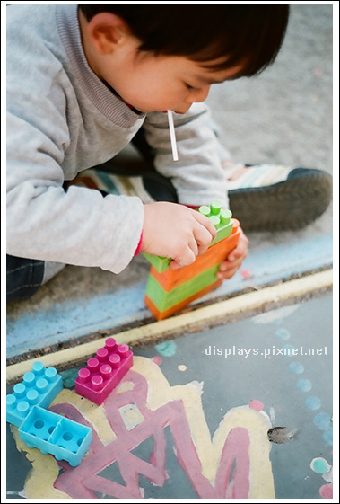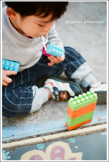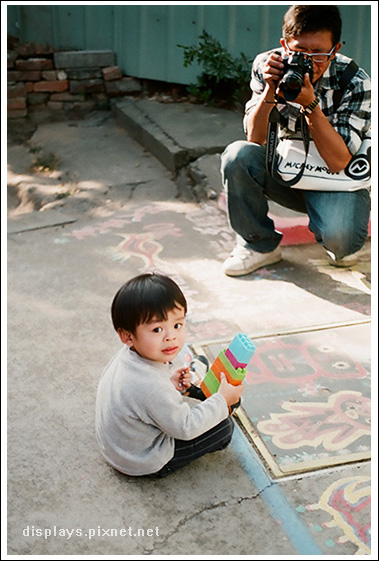 在春安巷裡,一個眷村小孩,一直繞著我團團轉,用無辜清澈渴望的眼神貼著我(老娘我這麼有"孕"味嗎?這麼想喝奶嗎?),對小孩不知所措的我,只好跟著他一起團團轉,用盡心思想要融入他的社會。為了展現我和藹可親的大姐姐形象,想要跟他一起玩,我把他手上的積木搶過來拆散(呼~幸好他沒有大哭),他好像不想跟別人分享,他自己就坐在地上重新組合他的101大樓。(注意到下面兩張照片裡,積木組合不一樣了嗎?)