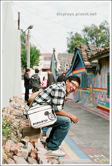 之前聽說,把眷村「搞」成這樣的作者,是位老伯伯,可能因為今天觀光客太多,他沒有出來解說畫畫的心得和當年勇,只有在老伯伯要出門買東西之時,被其他觀光客堵到,我也不免俗的擠向前,留下這位人老心不老的老伯畫家。