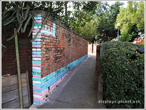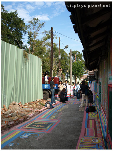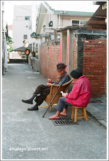 老伯伯以他家為起點,逐漸向外擴展他的畫布,畫布上的畫作風格鮮明,多是童心和異想的塗鴉,和勸世人的語句。說真的,很難想像作者是位70、80歲的老伯伯(有這麼老嗎?﹚。這個眷村幾乎都只剩住老一輩的長輩或是年稚幼童,像我們這樣的觀光客越來越多,會不會打擾到他們原本安寧的生活作息呢?我在繪畫巷的盡頭轉彎裡,看到三四位老先生老太太在自家門前曬太陽嗑牙、聊八卦(?)。