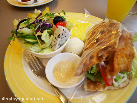 ↑貝殼套餐,有新鮮沙拉、馬鈴薯泥球、會流汁的散煎蛋、貝殼餅和附餐飲料,我選柳橙汁。