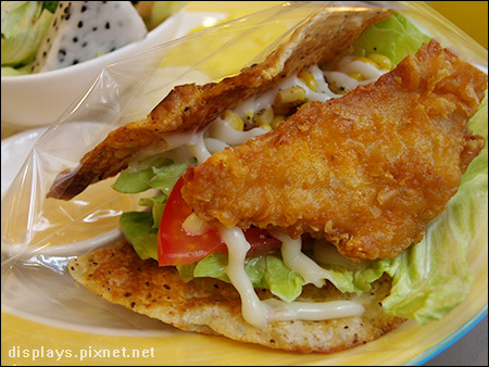 外殼薄片烤至酥脆夾上鮮嫩多汁的卡啦雞腿塊,再搭上蔬菜、玉米、蕃茄淋上美奶滋和些微黑胡椒帶味,滋味不賴,不大不小的size,可當下午茶點心,也可進階當輕食晚餐主角。