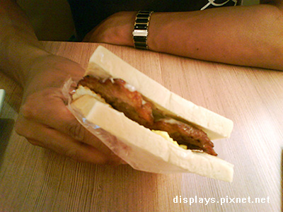 裡面就是不怎麼烤過的有邊吐司抹上美乃滋,一片打過的薄里肌肉,煎蛋,灑上一些胡椒,完工!
