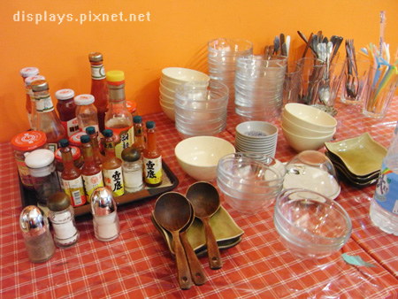 等餐的時候,隨意逛逛看看,有個自助料理台,上面有提供礦泉水、湯匙筷子,通通自己來。