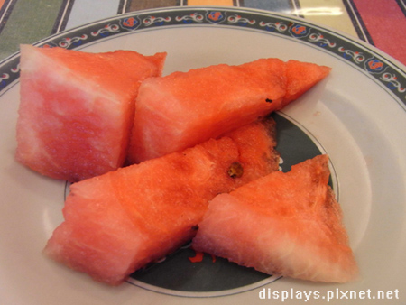 最後老闆端上招待的西瓜,我們已經撐到不行了...但是看在老闆熱切的眼神下,我們還是把它吃光了...