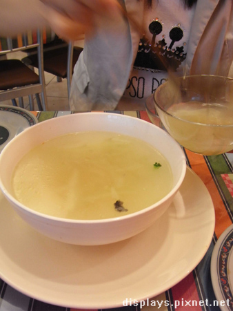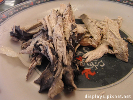 蔬菜湯裡面沒什麼蔬菜,只有燉到軟嫩的高麗菜幾葉,湯頭應該是後來老闆說招待的烏骨雞肉絲的骨頭熬的,口味偏淡還是什麼,我有點忘記了,我們湯剩不少,老闆還特別關心的問,湯不好喝嗎?我看看唯一的另外一桌家庭式客人,那碗湯也剩不少阿!XD