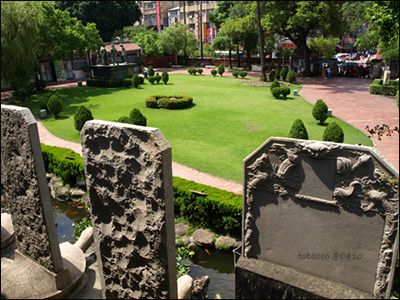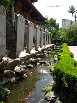 前面是一排烏龜背著石牌,後面的石牌都還有石雕和刻字,不過時間已久,很多都毀壞了。這裡每一個造景池塘都有養很多鯉魚喔!