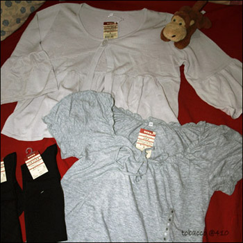 回家打開福袋檢視,裡面有一件上衣、一件針織短版小外套、一件卡其布的洋裝、兩雙襪子。